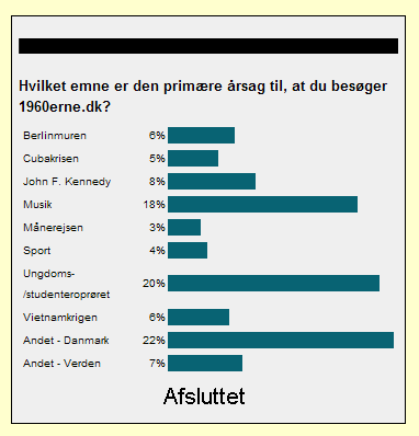 Tidligere er 1960erne.dk's besøgende blevet spurgt om årsagen til at de besøgte sitet. Resultaterne ses her under: